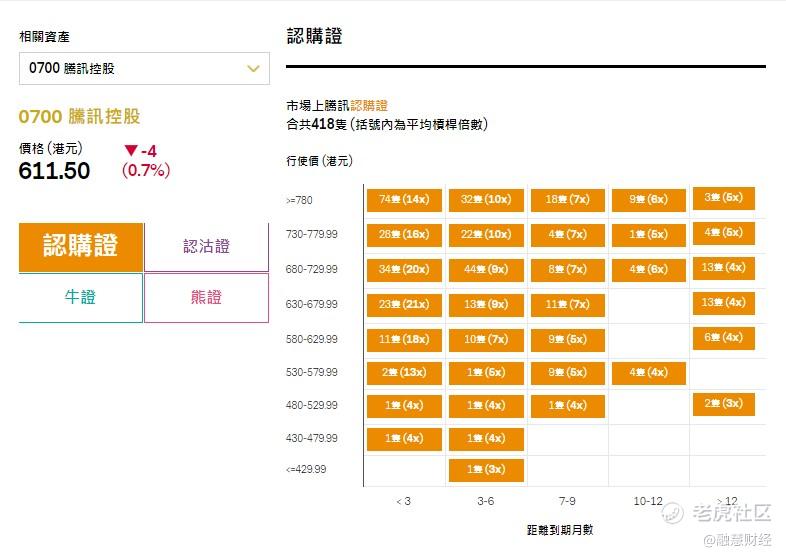 騰訊上日收市報611.5元,跌4元,將於今天派息。市場上合共有418只騰訊認購證,行使價在630~679.99水平的認購證合共有60只,產品杠杆4~21倍。