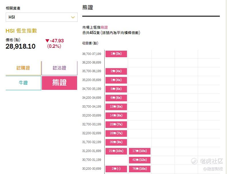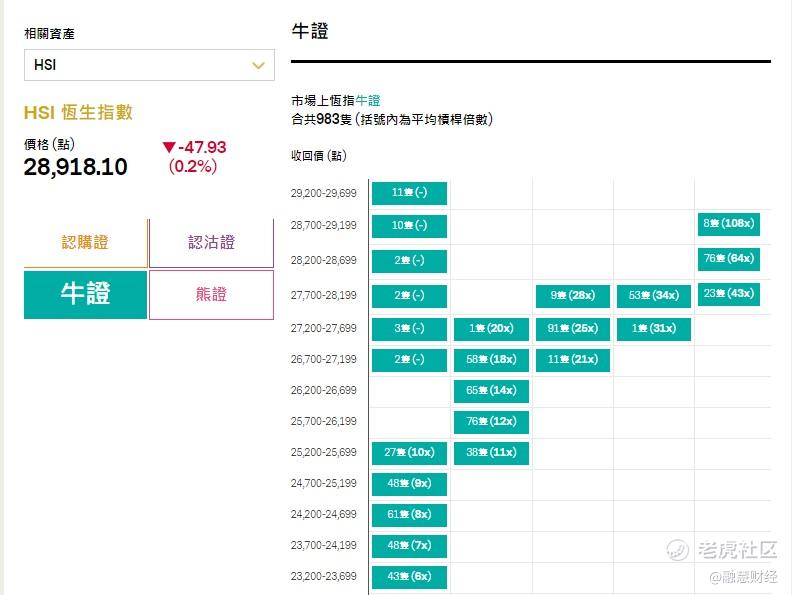 至於恒指牛證,目前市場上合共有983只恒指牛證,最貼價牛證收回價位於29200~29699,當中合共有11只產品;恒指熊證最貼價產品合共有69只,整個市場則有451只恒指熊證。