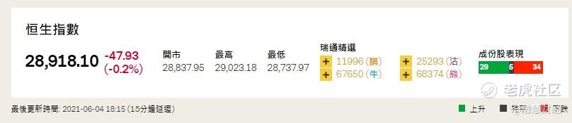 截止6月4日收市,恒生指數收報28918點,跌48點或跌0.2%。恒指成分股表現中,29只個股錄得升幅,34只個股錄得跌幅。