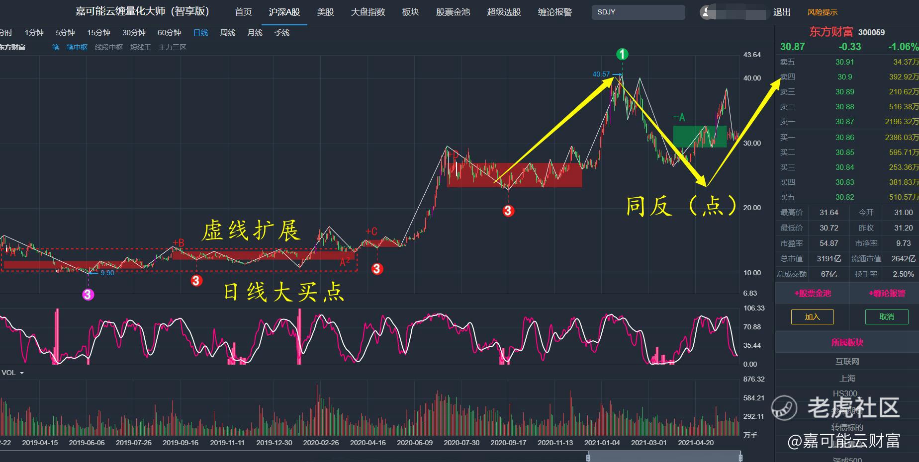 比如,像东方财富(300059)这种日线缠论大买点,不是中长线爱好者,估计很难拿得住,如下图所示: