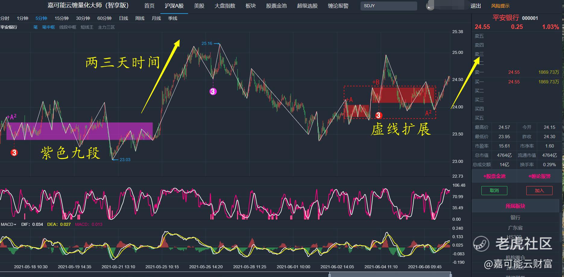 反而过来,如果你交易缠论短线,持股时间也不可能太长。比如就像平安银行(000001)在5分钟缠论紫色九段强势信号,一波上涨,两三天就结束了,如下图所示: