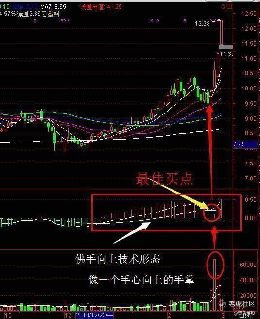 佛手向上技术形态最佳买点:macd白色线形成放量拐点之时,为最佳买点。