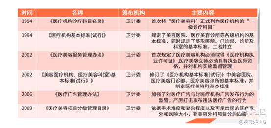 在政策完善方面,为保证医美行业的健康高速发展,以 1994年出台的《医疗机构基本标准(试行)》为起点,卫生部出台了一系列政策支持医美行业的规范化。