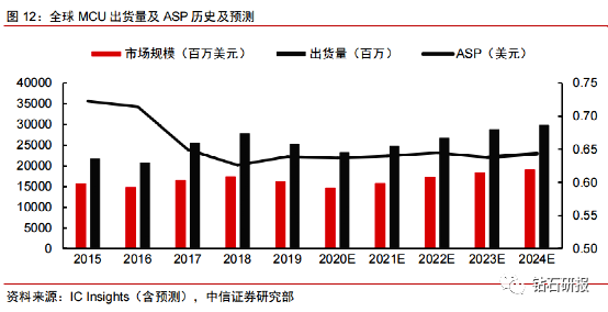 下游需求刺激出货量不断走高,过去多年行业ASP逐年下降,未来料将基本稳定。采用ARM内核降低了MCU厂商的开发难度,2017年ARM Cortex-M0/M3内核免授权费,进一步降低了MCU开发厂商的成本。随着产品出货量的持续提升,产品平均价格也逐年下降。根据IC Insights预测,未来几年MCU市场平均价格将基本稳定在0.65美金左右。