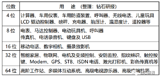 2、32位MCU市场占比持续增长,8位MCU仍长盛不衰。MCU按用途可分为通用型和专用型,按照位数分为4位、8位、16位、32位、64位等,32位MCU为目前主流。位数(bit)指MCU一次能处理的数据宽度,位数越大,MCU一次处理的数据量也就越大、处理速度也就越快。以当前普遍采用的32位和8位MCU作比较,32位通常应用于需要具备一定算力的场景,例如变频控制、智能家居等,而8位通常用来实现一些简单的控制功能,如电动玩具、充电器等。