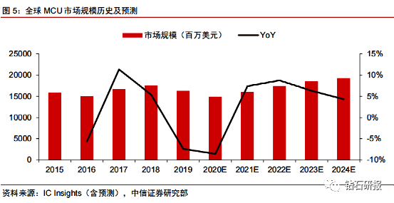 1、MCU产业:全球市场规模160亿美元,未来四年增速约6.7%。