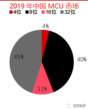 中国MCU市场中8位MCU和32位MCU占比均较大,8位MCU仍有较大市场。CSIA公布的信息显示,2019年8位MCU和32位MCU芯片分别占据国内市场的40%和45%的份额。国内8位MCU仍然得到长期大量应用的原因包括:一方面,长期的客户使用习惯,8位MCU简单易用,技术成熟,比16位和32位MCU更容易编程和故障排除,在许多产品中已长期沿用;另一方面是由于成本控制,仍有很多成本敏感型应用需要更低价的MCU。