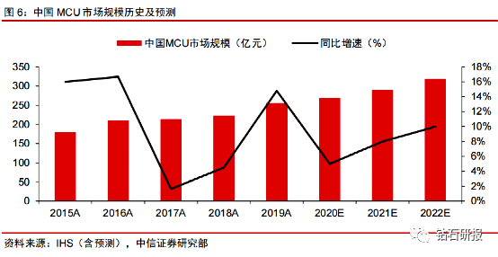 IHS预测2021年国内MCU市场规模约290亿元,增速大于全球增速。随着中国大陆消费电子、汽车电子和物联网的快速发展,对MCU的需求越来越大,据IHS数据,2008~2018年间,中国MCU市场CAGR为7.2%,是同期全球MCU市场增长率的4倍,IHS预计2020年中国MCU市场规模将超过268亿元,2020~2022年均增速达9%,增长速度仍将领先全球。