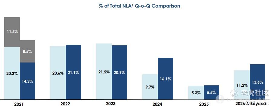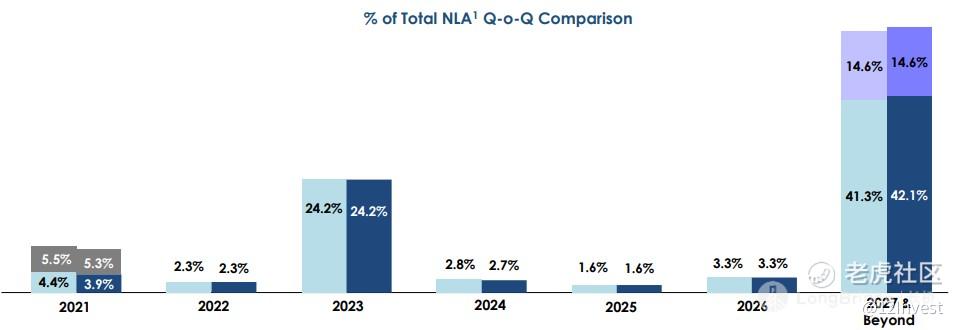 从图中的数据来看,在 2021 年内新加坡的办公楼有 16.9% 的租凭合约将会到期、有 14.3% 的商场租凭合约将会到期、而在国外市场的租凭合约只有 3.9% 会在 2021 年内到期。整体上来看,短期内应不会面临太大的问题。