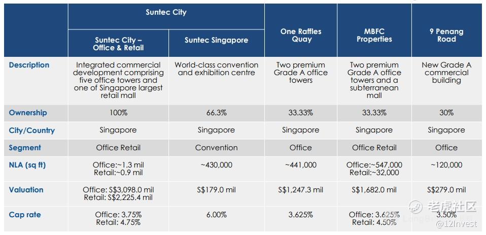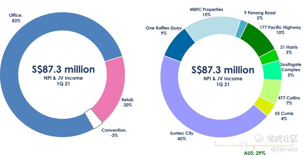 以公司在 2021 财政年第一季度的净产业收入(“NPI”)以及联营公司所贡献的盈亏为计算的话,公司约有 83.0% 的收入来自于办公楼型的产业、20.0% 的收入来自于商场型资产;而多出来的 3.0% 其实是因为公司旗下 Suntec City 的资产包含了办公楼、商场以及展览中心,因此综合的数据才会 “多出 “ 额外的 3.0%。
