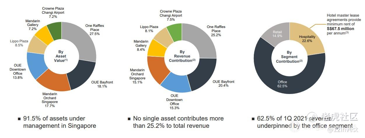 从图中,我们可以看到公司的资产有 91.5% 都集中在寸土寸金的新加坡;而且也并没有单一资产占了公司太大的营业额贡献,因此从这里来看,风险依然在可控范围内。而公司在 2021 财政年第一季度的营业额也有 62.5% 来自于办公楼、22.6% 来自于酒店的主租约,每年将会给公司带来最少 0.7 亿新币左右的营业额、以及最后的 14.9% 来自于其商场的收入(Mandarin Gallery)。