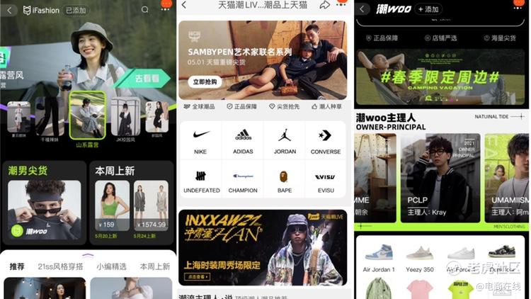 淘宝的潮流生意来得更早。2016年开始,淘宝推出了一个名为“iFashion”的潮流频道,它针对的主要是女生。占据iFashion最大版面的是各种趋势风格,譬如JK校园风、山系露营风、千禧辣妹风等。而淘宝和天猫后来不断推出的“潮Woo”和“天猫潮LIVE”,则定位潮男尖货,“潮WOO”频道内,banner滚动的内容包括首发预售、限定周边和球鞋测评。