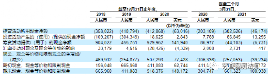 2018年、2019年、2020年、2021年一季度经营现金流净额分别为-3.58亿元、-4.11亿元、-4.13亿元、-3.03亿元。