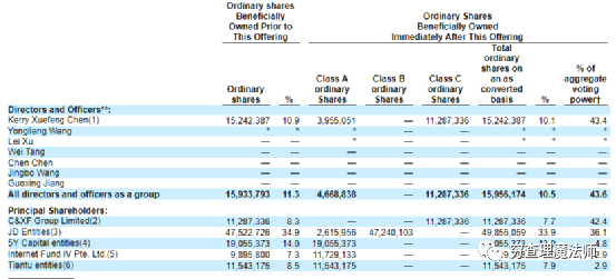 招股书显示,IPO后,创始人陈雪峰通过C&XF Group Limited持股占比7.7%,有42.4%股票权;京东集团持股为33.9%,有36.1%投票权。