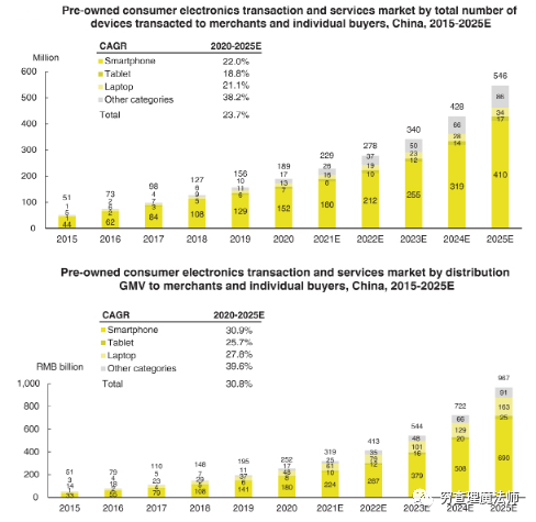 根据CIC预测,2020年,按与商家和消费者交易的设备总数计算,中国二手消费电子产品的交易和服务市场为1.886亿台,到2025年该市场的复合年增长率预计为23.7%,达到5.458亿台。中国二手消费电子产品交易和服务市场将达到人民币2,522亿元,该市场的复合年增长率预计为30.8%,到2025年将达到人民币9673亿元。