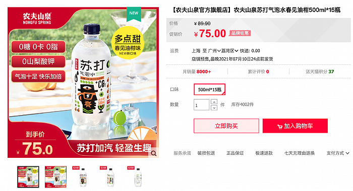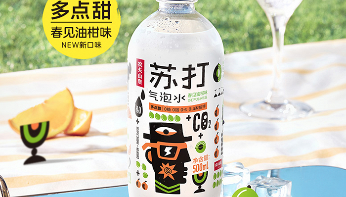 6月16日,农夫山泉在微信公众号宣布推出“春见油柑味”苏打气泡水。这款产品遵循了这两年来“果汁+气泡”类饮品走红的趋势,用柑橘搭配了微涩回甘的油柑,并强调“0糖0脂0卡0山梨酸钾”的卖点。新品目前在农夫山泉天猫旗舰店的售价为75元(500ml*15瓶),合5元/500ml。