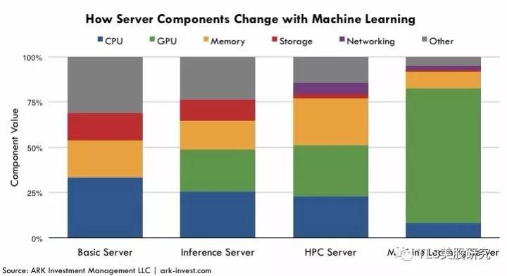 下图形象的说明了机器学习所需要的服务器和别的计算功能为主的服务器对显卡需求量的不同。显卡为绿色,很明显,用来进行机器学习的服务器近80%的价值都在显卡上。若AI 10年间发展趋势乐观,英伟达将会持续增长。