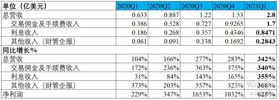 分业务看,Q1交易佣金及手续费收入1.7亿美元,同比增长342%,利息收入8471万美元,同比增长355%,其他收入(含财富管理、企业服务业务等)2843万美元,同比增长366%。