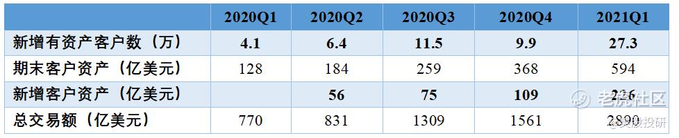 Q1尤为亮眼的是新增开户数,达到27.3万,创单季度净增历史新高。2020Q4的新增开户数只有9.9万,相比Q3的新增用户11.5万下滑。这个数据当时引发了很多投资者的恐慌。