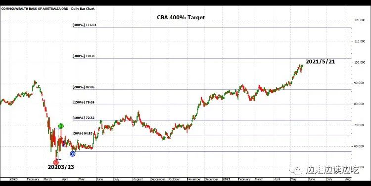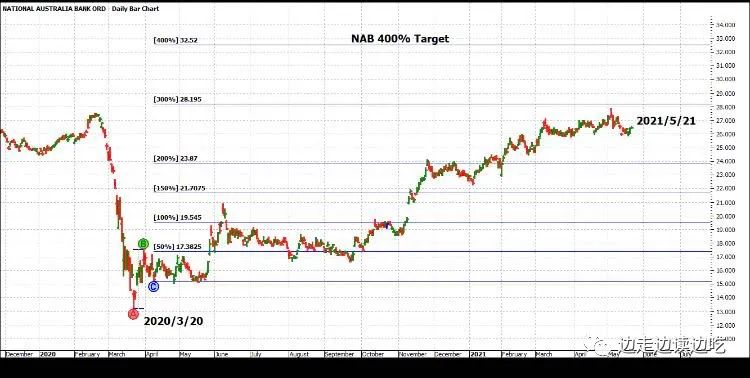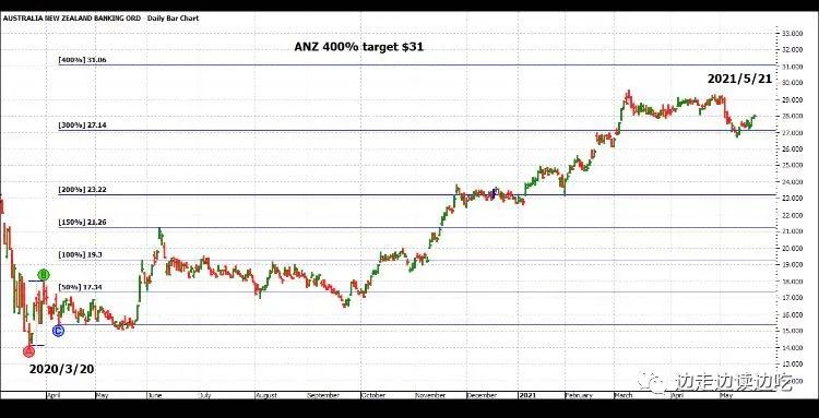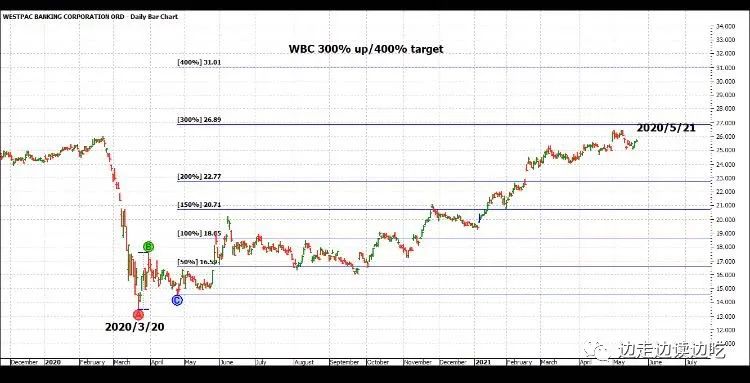 毫无例外,澳纽银行也是如此,以2020年3月23日第一浪为标准来上升,升至100%和150%阻力位时下跌,在50%阻力位筑底上扬,在200%阻力位横盘一月余,冲破了300%阻力线,又下跌至300%阻力线筑双底。
