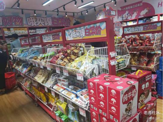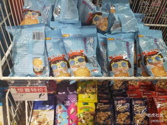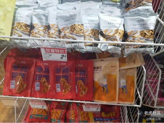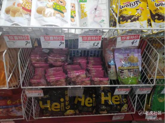 这五个纵向货架区摆放的商品普遍特点是,客单价低,平均都在10元以内,有的甚至是1元-3元,品类多为较受欢迎的零食,如卤味、薯片、糕点和各种糖果。一个猜测是,这五个货架售卖的商品为店里的“引流”商品,让消费者在这买一些商品尝到“甜头”后继续往店里面逛。