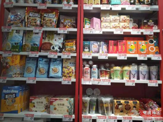 与饮料区和个护区相连接的是三个货架及仓库区。三个货架摆放的是麦片、冲泡奶茶、调味料、面食、糖果、曲奇和巧克力等产品。