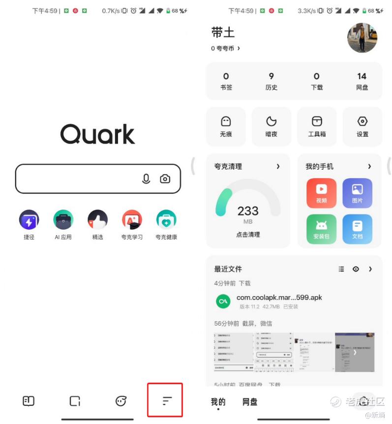 除此以外,还有一个比较大的改动,我觉得有必要跟大家提一下,在夸克 5.0 中,右下角的菜单栏是默认进入个人中心的,方便我们清理文件和查找文件。但有的用户会很不习惯这种操作方式,毕竟以前都是直接进入设置界面的嘛。