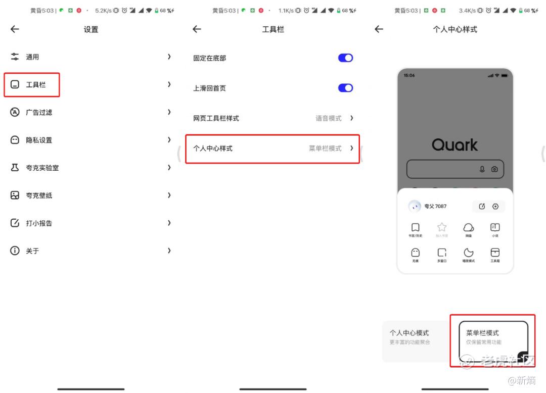 So,夸克贴心地保留了原来的操作逻辑。在「设置」 - 「工具栏」 - 「个人中心样式」中,咱们可以自由选择,右下角是进入个人中心还是打开菜单栏。多的不说,我觉得这波操作还是挺贴心的。