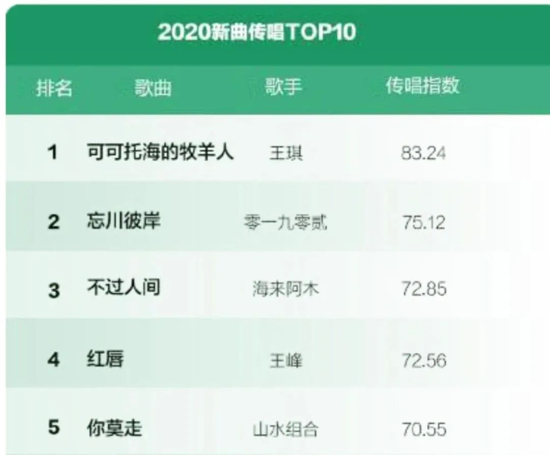▲《可可托海的牧羊人》获得腾讯娱乐白皮书2020新曲传唱榜冠军。图 / 网络