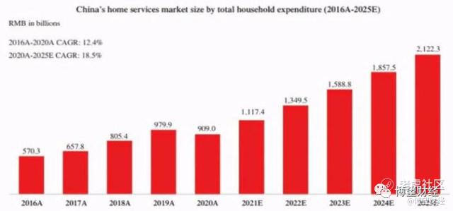据艾瑞咨询数据显示,中国家政服务总支出从2016年的5703亿元增加到2020年的9090亿元,年复合增长率为12.4%,预计将以18.5%的年复合增长率进一步增长到2025年的2.1万亿元人民币。此外,在大约4.94亿的总家庭户数中,2020年已有3900万家庭使用过外包家政服务。