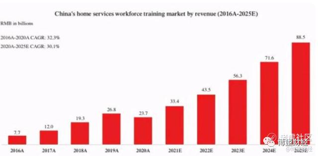 与此同时,据艾瑞咨询数据显示,家政服务劳动者培训的市场规模从2016年的77亿元人民币增加到2020年的237亿元,年复合增长率为32.3%,并且预计从2020年到2025年年复合增长率仍将保持30.1%,达885亿元人民币。