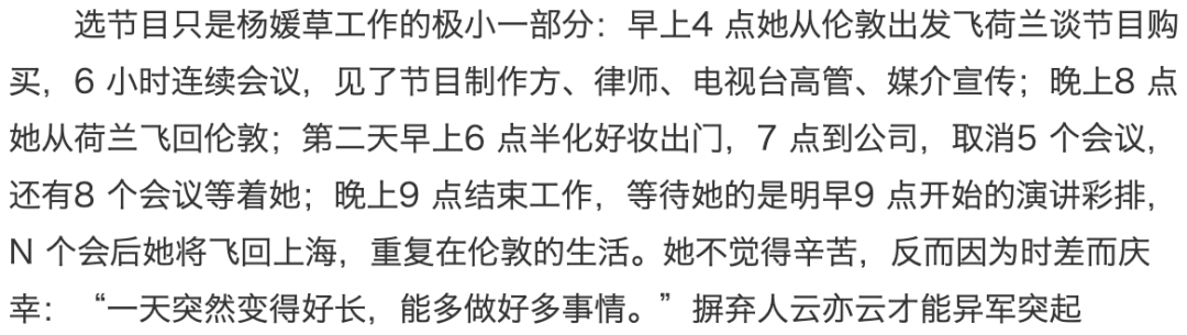 最后,光有人脉也是不够的,我们还能看到杨媛草身上的那种职业人的素养,她热爱做事,热爱工作,并且对整个行业也非常具有专业见识。