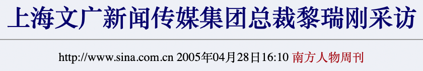 时间来到千禧年,黎瑞刚被送去哥伦比亚大学担任访问学者,回来后随即被指派到新成立的上海文广新闻传媒集团(即SMG)出任总裁。