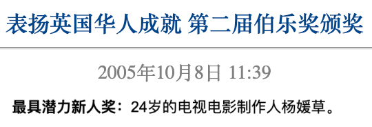 04年,杨媛草选择自主创业,开设了Wild Production(野草影视制作公司,野草这名字取得就很蓬勃),然后同年制作了一部关于文化交流的专题片《挑战异文化》,荣获了英国伯乐基金会用于表彰华人在英贡献的伯乐奖。