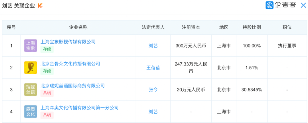 ▲看了眼刘艺而今的事业版图,和黎瑞刚毫无交集(图源:企查查)。最下面的森奥文化就是当年她和王梓合伙开的公司。