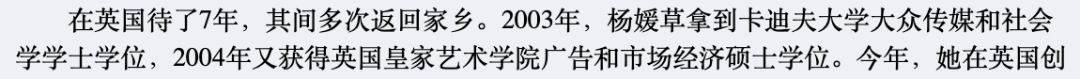 19岁,杨媛草来到英国求学。先是获得了卡迪夫大学的大众传媒和社会学学士学位,后又获得了英国皇家艺术学院广告和市场经济的硕士,这两个学校在英国也是相当当的没水份。