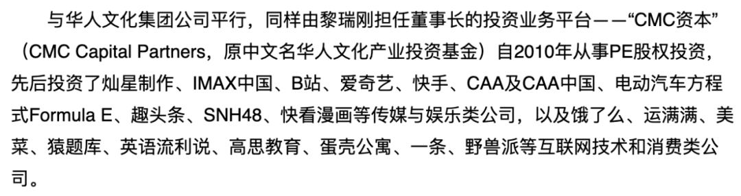 经常提到的华人文化其实有两大块组成,一是国内首个文化产业私募股权基金,华人文化产业投资基金(即上文提到的CMC资本),背靠国家发改委,专注投资布局;另一是负责运营的华人文化集团(即CMC Inc.),偏重产业体系搭建。