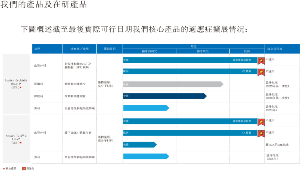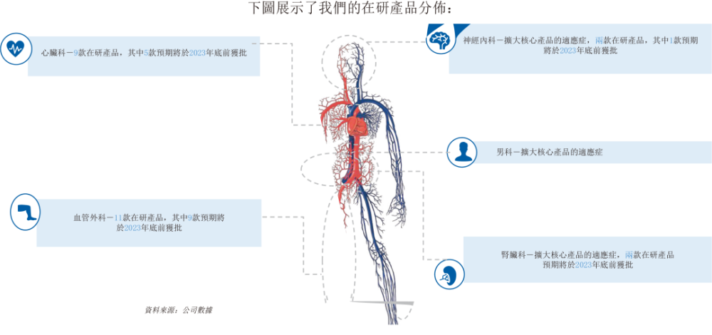 适应症方面,公司的DCB疗法在治疗CAD及PAD等其他类型血管疾病效果显着,同时,公司正积极将旗下核心产品的适应症拓展至肾脏科、神经科及内科领域,以解决其他类型血管疾病患者未被满足或未被照顾到的临床需求,如动静脉瘻(AVF)狭窄症、椎动脉粥样硬化狭窄症和血管源性勃起功能障碍。除核心产品的三个治疗领域的适应症扩展外,公司还拥有24个额外的在研产品,能够很好形成后续产品支撑。