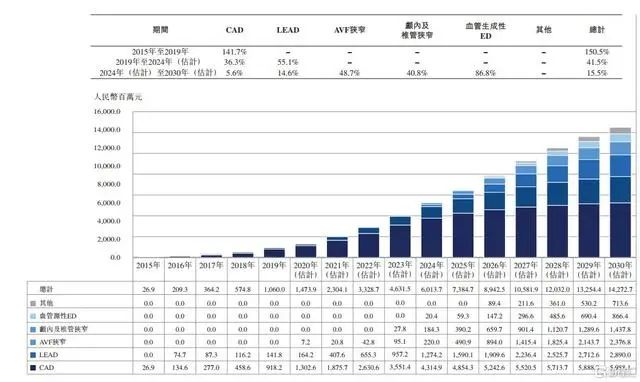 根据弗若斯特沙利文的资料,中国下肢动脉疾病(LEAD)患者数量从2015年3580万名按复合年增长率2.5%增加到2019年3960万名,并预计于2019年至2030年按复合年增长率2.1%进一步增至2030年的4980万名。