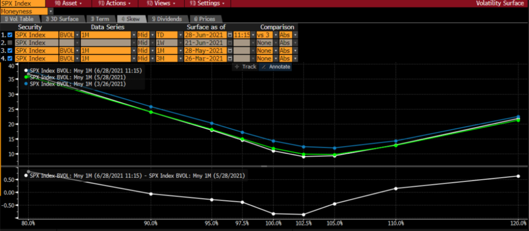 标普500指数偏斜指数情况,2021年6月28日、5月28日和3月26日的1月期期权的隐含波动率