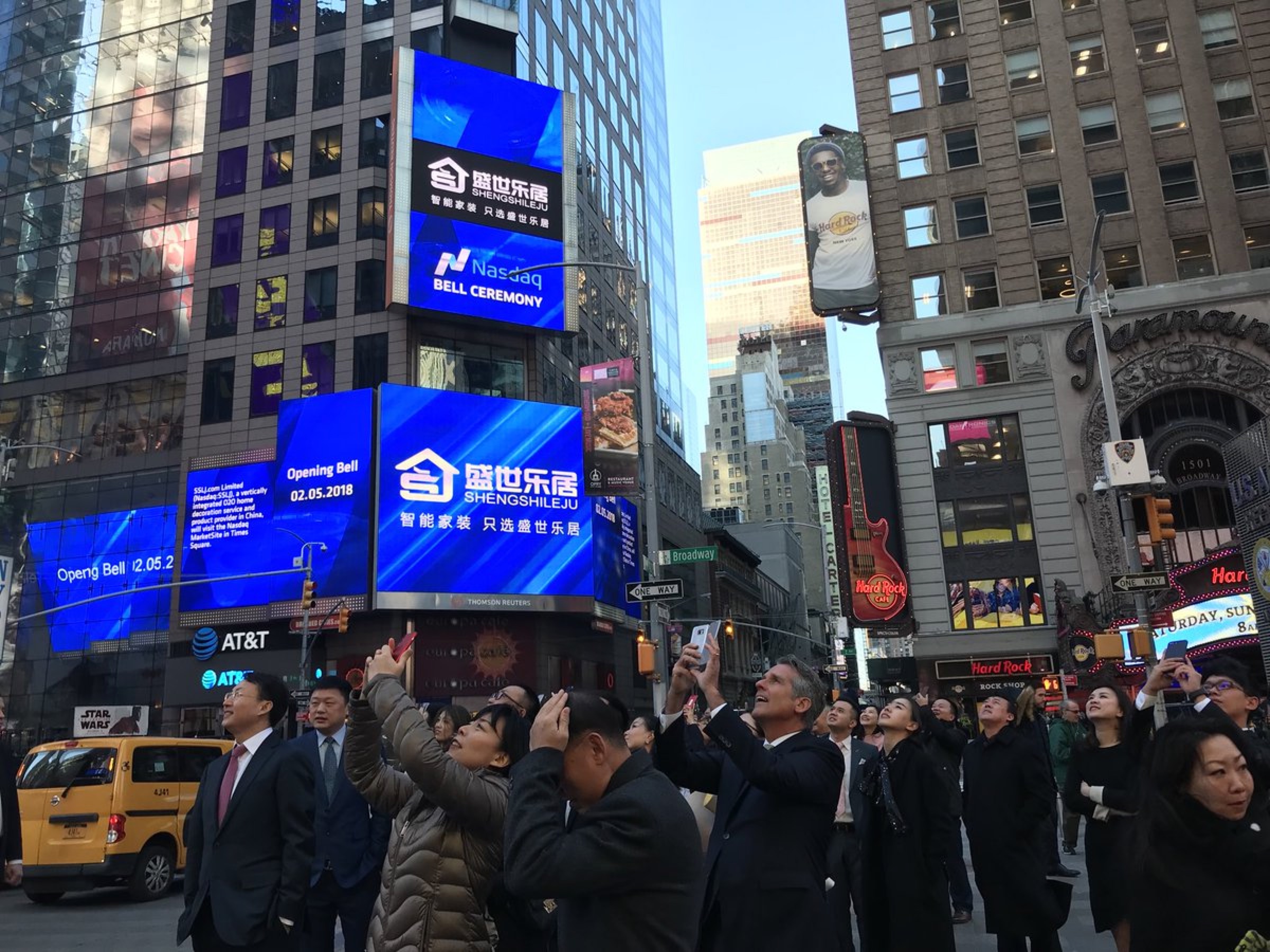 美国东部时间2018年2月5日早9点15分,盛世乐居(武汉)科技控股有限公司(以下简称盛世乐居)在纽约时代广场纳斯达克交易所完成敲钟仪式,开盘价为每股5美元,这预示着盛世乐居(纳斯达克股票代码SSLJ)在美国正式上市。