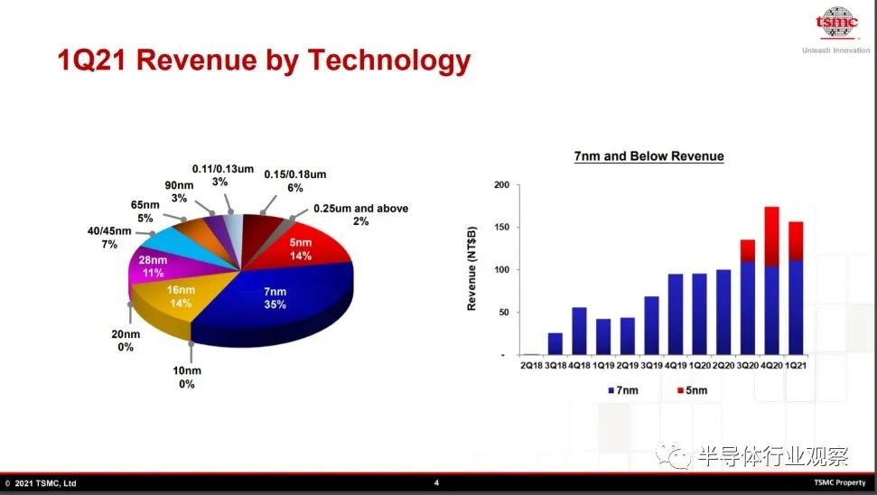 从上面数据可以看到,台积电2020年第一季度FinFET工艺收入占比54.5%,在2021年第一季度更是达到惊人的63%。FinFET收入增长背后,离不开台积电在此的专注和投入,在当前半导体短缺的情况下,台积电3年投资1000亿美元建设大量的FinFET产能,应对市场和客户需求。同时,台积电正在努力推动其500多个客户进入FinFET时代,加速其繁荣。