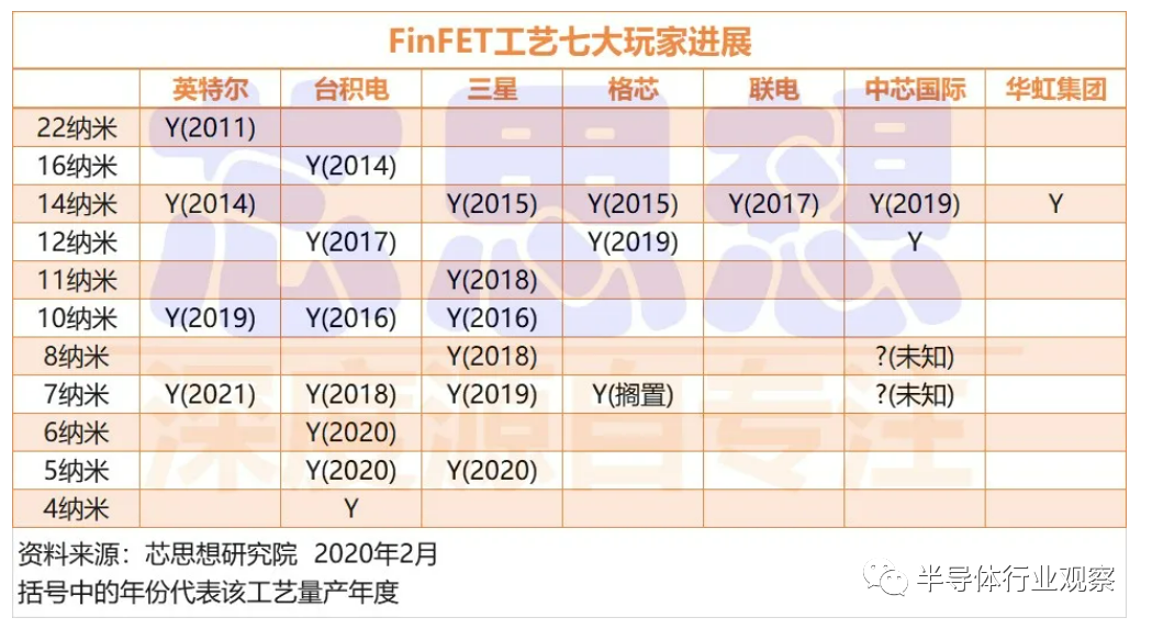 FinFET工艺七大玩家进展(图源:芯思想)