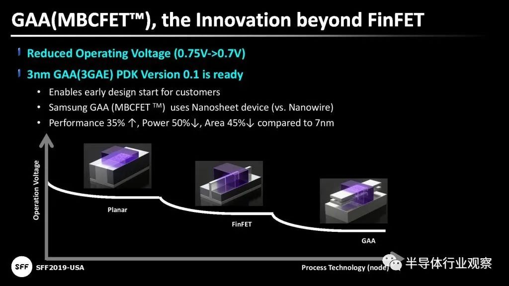 根据三星的说法,与7nm FinFET制造工艺相比,3nm GAA技术的逻辑面积效率提高了35%以上,功耗降低50%,逻辑面积减少45%。