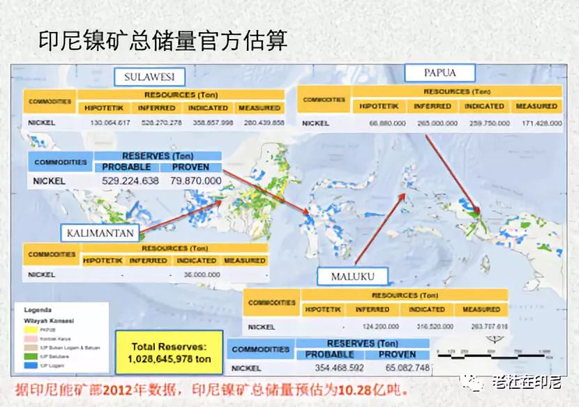 印尼矿业专家协会主席 Rizal Kasli 解释说,印尼镍属于红土型,主要发现于苏拉威西岛和北马鲁古岛。据能源矿产部地质局数据,印尼镍资源量达115.5亿吨,探明储量10.8亿吨,预估储量35亿吨。