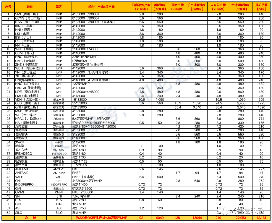 最近又根据最新进展情况更新了一下,吓了一跳:目前的镍产能已经达到了92万镍吨,耗矿9000万湿吨,预计三年内将达到219万镍吨,每年耗矿2.2亿湿吨!