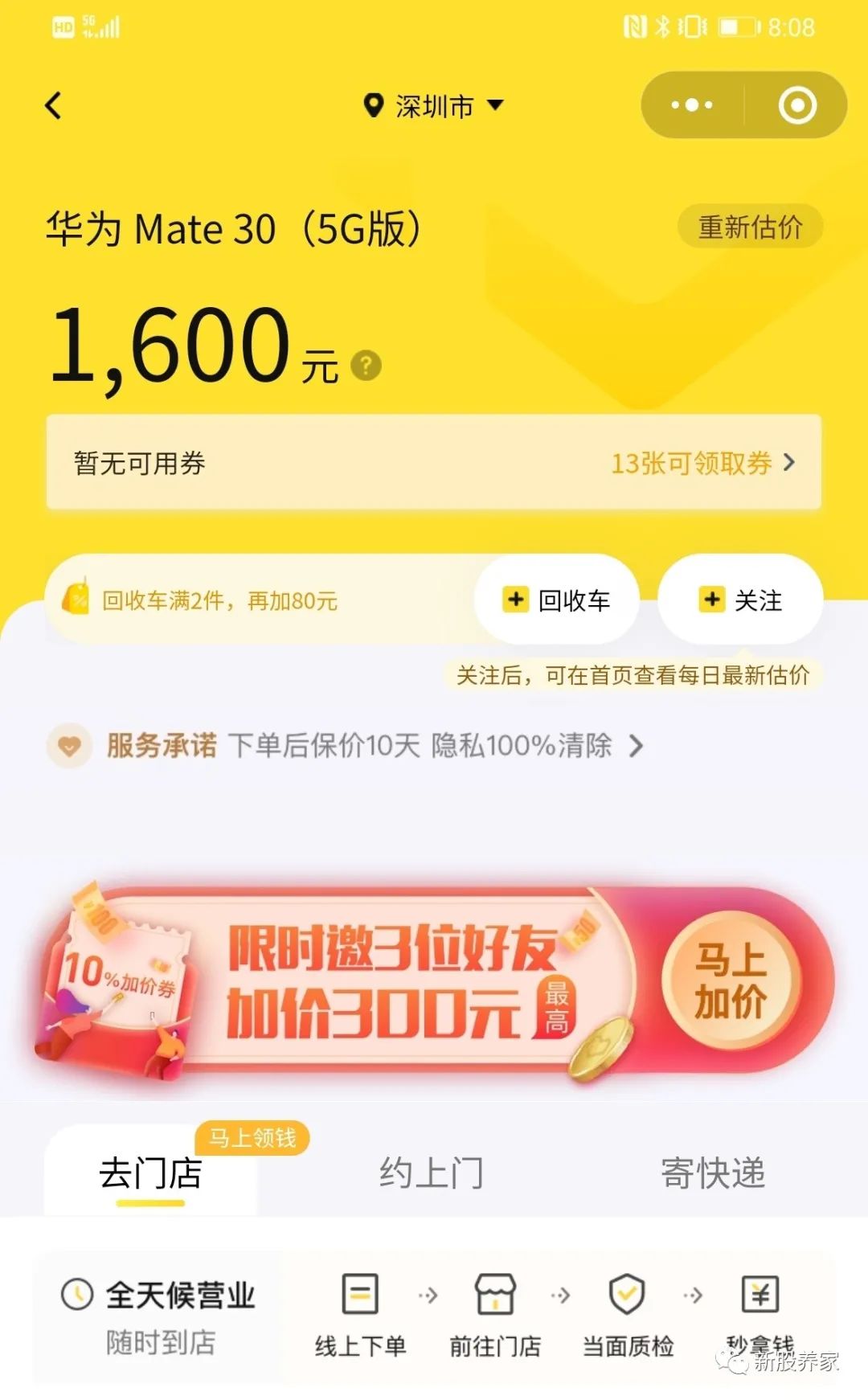 1、先点开“爱回收”的小程序,发现主要是C端收货,B端卖货,以我自己的华为mate30为例,屏幕摔碎款,回收价大约1600元,财报上25-30%的毛利率,大概会以2000元卖给下游,拼多多上一手价格是3400元(曾在拼多多百亿补贴买过华为P30,感觉很难用),这其中还有一个大号的中间商在跟爱回收进行交易,所以爱回收会有大约8亿左右的应收账款出现,最后会到零售端,这样下游客户大约一部手机能赚个小几百,那么这个商业逻辑是跑的通的。