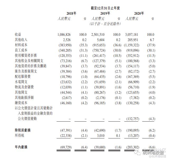 于2018至2020年,奈雪的茶订单中分别约有4.4%、12.5%及22.9%为客户通过的微信及支付宝小程序、奈雪的茶应用程序以及其他第三方外卖平台下达的外卖订单。2018至2020年收入分别为10.9亿、25亿、30.6亿元。净利润持续亏损,经调整后净利润于2020年转正,营收增长很快,但是材料成本和员工成本基本上也同步增长。