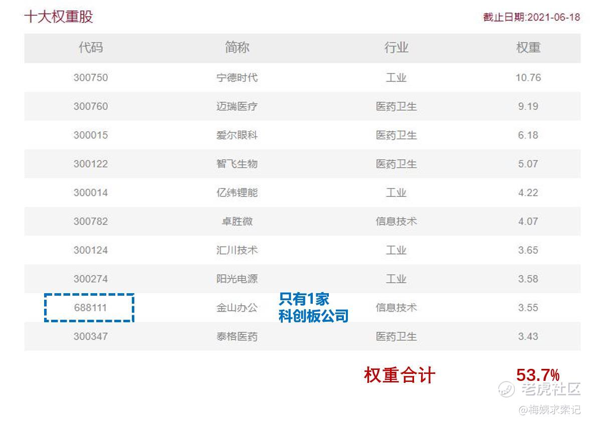 可以看到其前10大权重股,总权重占比53.7%;10只成分股中,只有1家金山办公是科创板公司;扣除掉金山办公3.55%的权重,也就是说,双创50指数哪怕只统计前10成分股,创业板公司的权重就已经占到了50%!