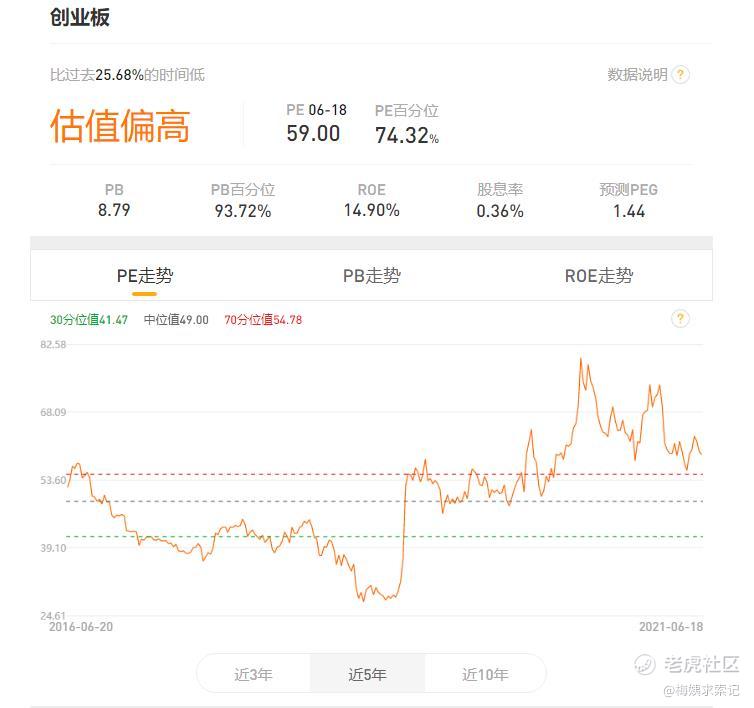 参考蛋卷基金的创业板估值数据,目前创业板指数PE百分位74.32%,也就是高于其自身历史上74.32%的时刻,整体估值还是偏贵了。